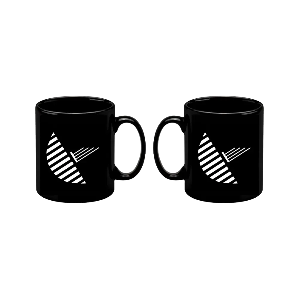 Black ceramic mug featuring the Public Service Broadcasting dish logo on the front and back.